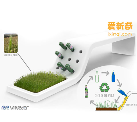 當下這個環保議題很熱門,今天给大伙也來環保的循環系统,我稱之為啤酒循環種植機。來看看上面那張圖的右下角,就是一個完美的循環釋義圖,那至于先有糧食還是先有啤酒就暫且擱置不談,呵呵。假設先到了超市購買了一瓶啤酒,喝完變成空瓶,再注滿水,將它倒插在這個循環種植機的槽口上,這樣掺有啤酒残液的水分就會顺着斜坡慢慢地流向底部,問糧食提供充分的營養,產出的糧食就可以再釀造成可口的啤酒客。是不是節能環保,兩全齊美的一個装置呢!這個設計孩獲得了Nastro Azzurro設計大獎喔!